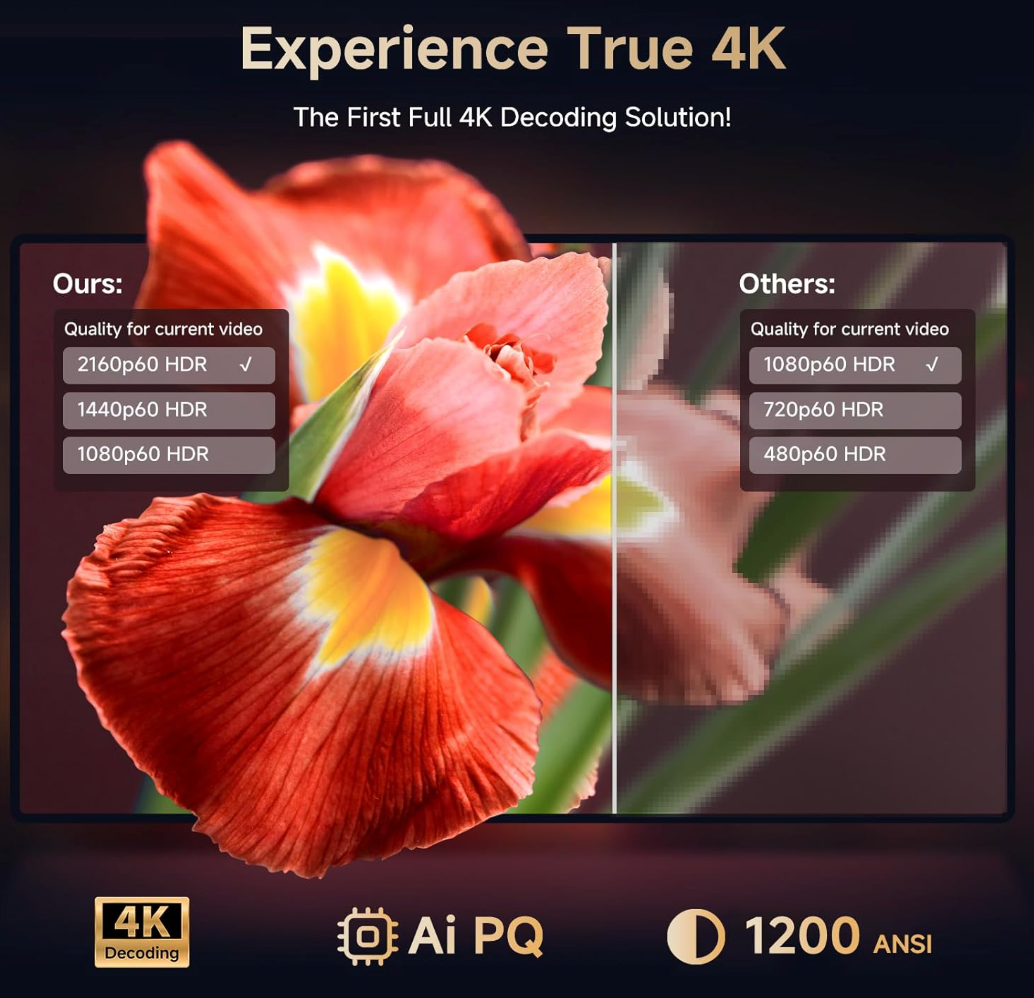 - Stunning Visual Feast – Full Decoding 4K & AI-Powered Color Enhancement: With the powerful MTK9660 chipset and a robust 2+8GB memory configuration, the native 1080P outdoor projector delivers true 4K decoding. Unlike other 4K support, our 1080P projector fully adapts to native 4K content, providing sharp, vibrant images that reveal every detail. Enhanced by AI PQ (Picture Quality) technology, German high-transmittance lenses, and HDR 10+, this smart projector ensures natural light-to-dark transitions, rich colors, and lifelike skin tones. Enjoy exceptional clarity and contrast, even as a ceiling projector, bringing your video to life with crisp visuals.