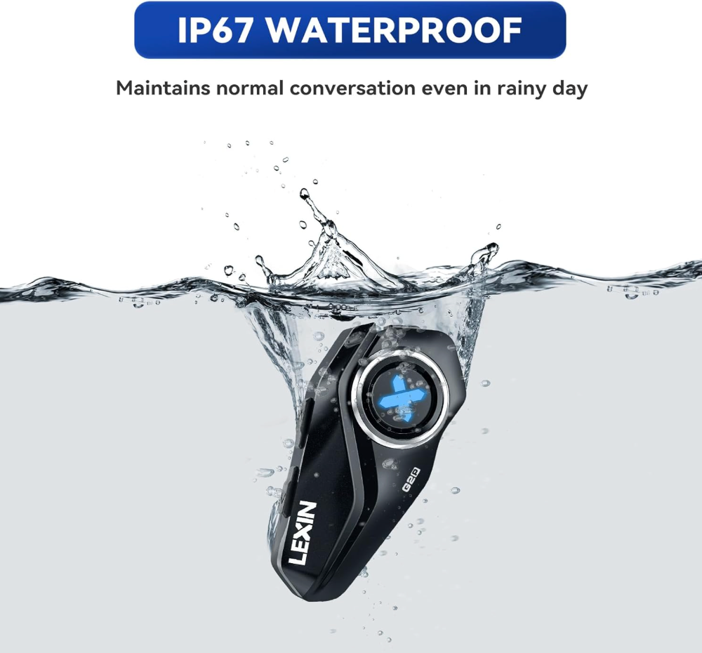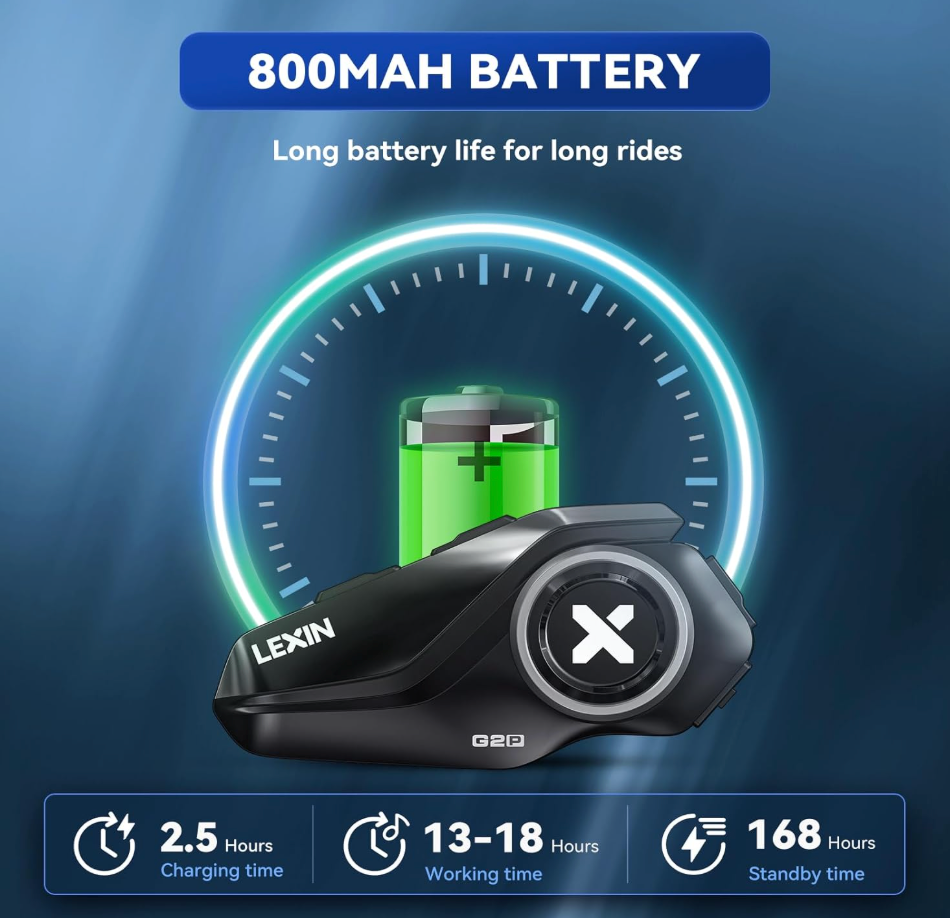 - Enhanced IP67 Waterproof & Battery Life: The G2P motorcycle headset boasts IP67 dustproof and water resistance, ensuring durability in rain, snow, and dust. Its 800mAh battery offers up to 25 hours of music playback, 20 hours of talk time, and over a week of standby. Plus, the quick charging keeps you powered up on the go