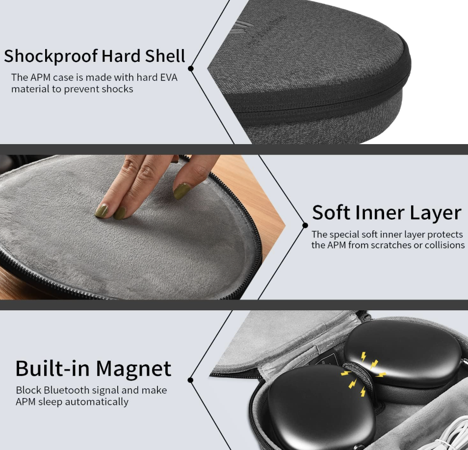 - There is enough space to fit the original APM case, allowing you to use it alone or in combination with the Apple Headphone original smart case. This specially designed APM case can also accommodate other accessories, if your ear cup is equipped with 2 protective covers.